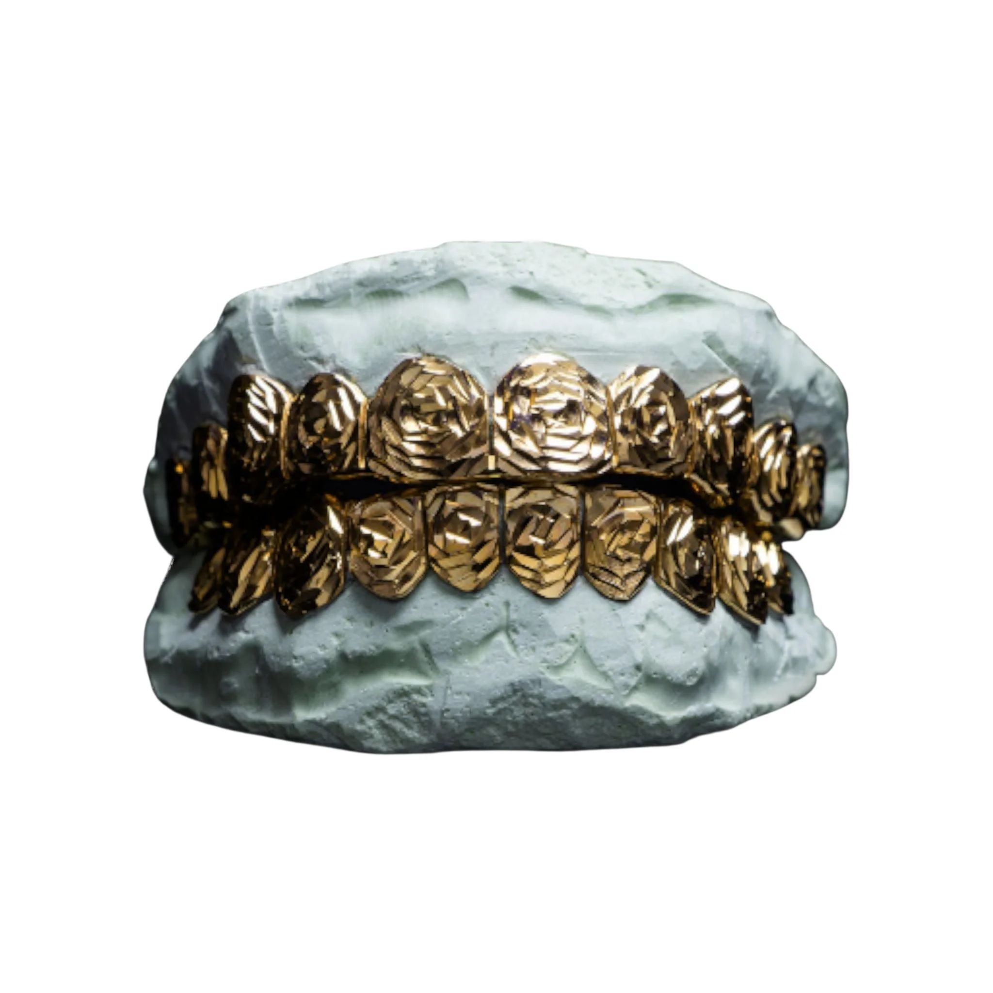 Solid gold grillz featuring rose-cut style and deep perm shaping. Wear them daily or frame them forever — either way, you’re investing in legacy drip.